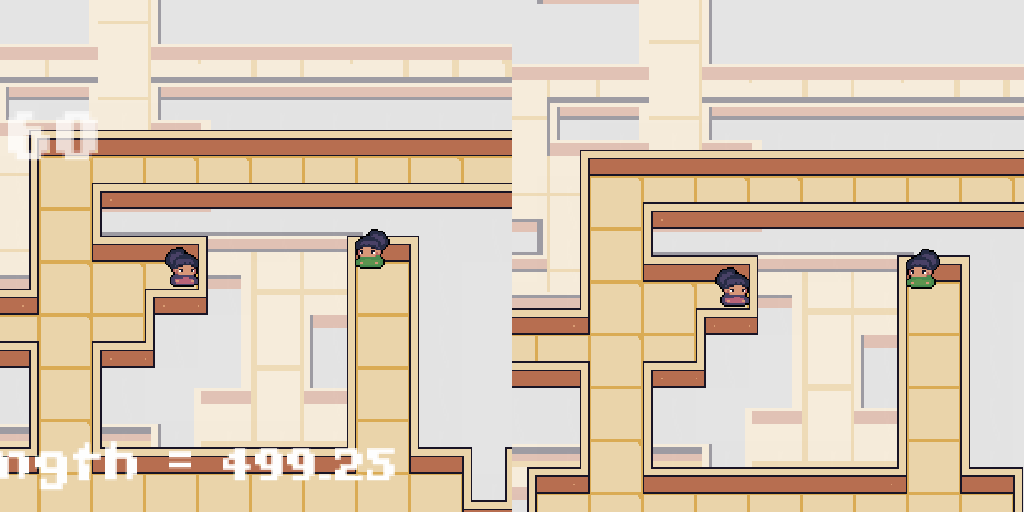 This is a proof of concept: It turns out that randomly generating mazes that must be solvable from every point, and by two people, has a really limited fun factor, and I would rather focus on individually building levels with unique challenges and puzzles than continue trying to add random obstacles.